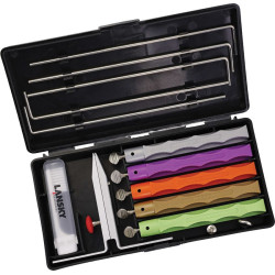 Le kit d'affûtage Lansky 5 pierres Deluxe est efficace pour affûter rapidement un bord, reconditionné un bord ou polir votre lame. Le système d'affûtage breveté de Lansky vous permet d'affûter vos lames selon 4 angles différents: 17, 20, 25 et 30 degrés.Inclus dans le kit :Serre-lame avec sélecteur d'angle, Coffret de rangement portatif, 1 tige-guide...