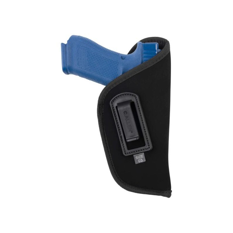 Le Holster tissu Allen Company Inside-The-Pant (ITP) Port Dissimulé Noir Droitier vous offre un holster à profil mince avec tissu extérieur doux pour une dissimulation facile et confortable. La doublure lisse anti-accroc vous aide avec des vitesses de dégainage plus rapides et est conçu pour tireurs droitiers. Le confort rencontre une construction robuste faisant de cette solution inside-the-pant (ITP) parfaite pour vos besoins de port dissimulé, tandis qu'un clip de ceinture moulé se fixe facilement, s'adaptant aux ceintures jusqu'à 5 cm de largeur. La Taille 03 s'adapte aux Glock G17, 22, 31, G20, 21, Beretta 92X Full Size, 92 FS, et autres marques/modèles de taille similaire avec canons de 11,4 à 12,7 cm et cadre large semi-automatique.