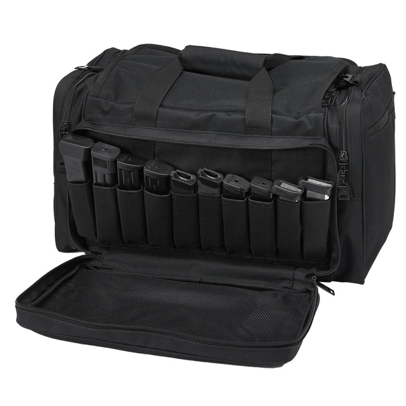 Le US Peacekeeper Large Range Bag P22215 est un sac de stand de tir robuste en polyester 600D ripstop hydrofuge. Livré avec 2 étuis pistolet amovibles et de nombreuses poches pour chargeurs et accessoires MOLLE compatibles.