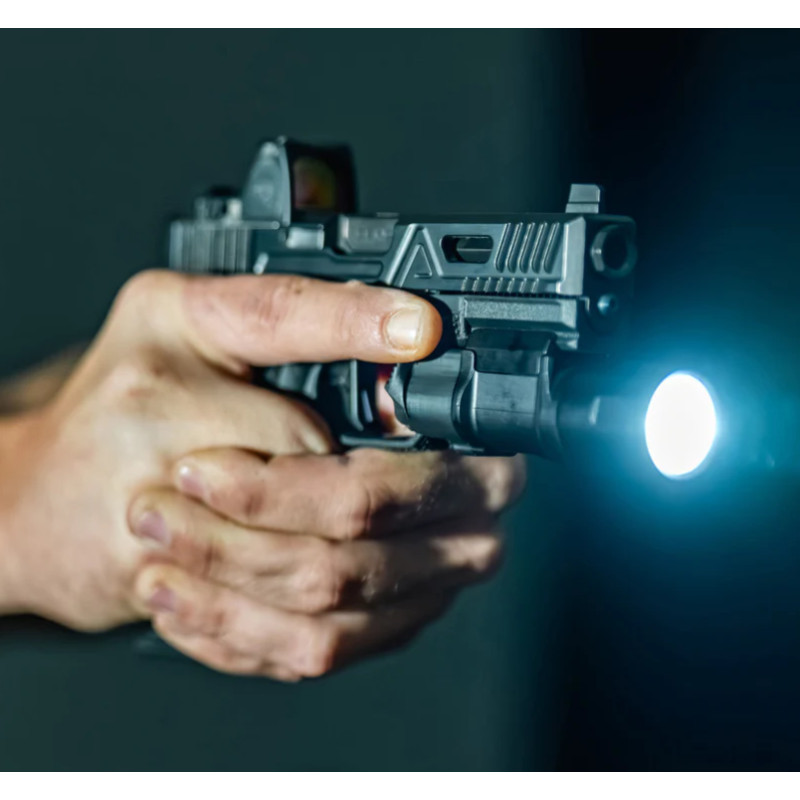 La Lampe Tactique Pistolet Cloud Defensive EPL Duty Noir représente le summum des performances et du design pour éclairage pistolet. Cette lampe combine performance carabine avec compacité pistolet, délivrant 1200 lumens et 52000 candela pour illumination exceptionnelle. Le design ergonomique optimisé offre activation intuitive par poussée avant, permettant maintien prise de tir tout en activant ou désactivant la lumière avec mouvement pouce vers l'avant ou doigt hors garde détente. Les toggles ambidextres disponibles en deux tailles permettent personnalisation selon taille main et application. Construction aluminium 6061-T6 anodisé Type III pour durabilité maximale. Tous éléments visserie sont plaqués nitrure noir pour résistance corrosion. Le capot arrière est moulé par injection en polymère résistant impacts. Lentille résistante impacts identique lampe MCH éprouvée. Étanche IPX-7 pour fiabilité toutes conditions. Autonomie 40 minutes avec batterie 18350-C rechargeable USB-C. Compatible holsters tactiques Safariland 6000 et 7000, compatibilité X300 et TLR-1