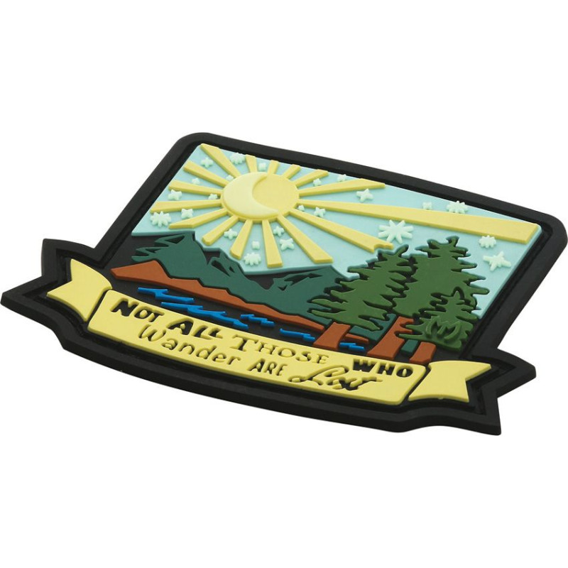 Ce écusson tactique Maxpedition en PVC caoutchouté 3D affiche un design original et détaillé. Version couleur. Texte : "Not all those who wander are lost" (en français : "Tous ceux qui errent ne sont pas perdus").
