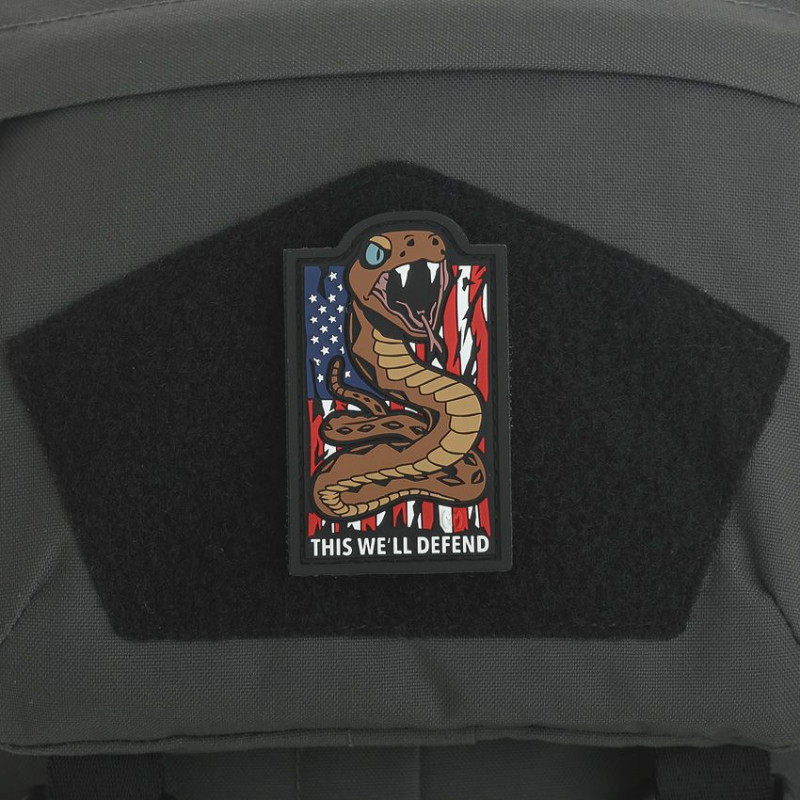 Ce morale patch Maxpedition en PVC caoutchouté 3D affiche un design original et détaillé. Version couleur. Texte : "This We'll Defend" (en français : "Cela Nous Le Défendrons").