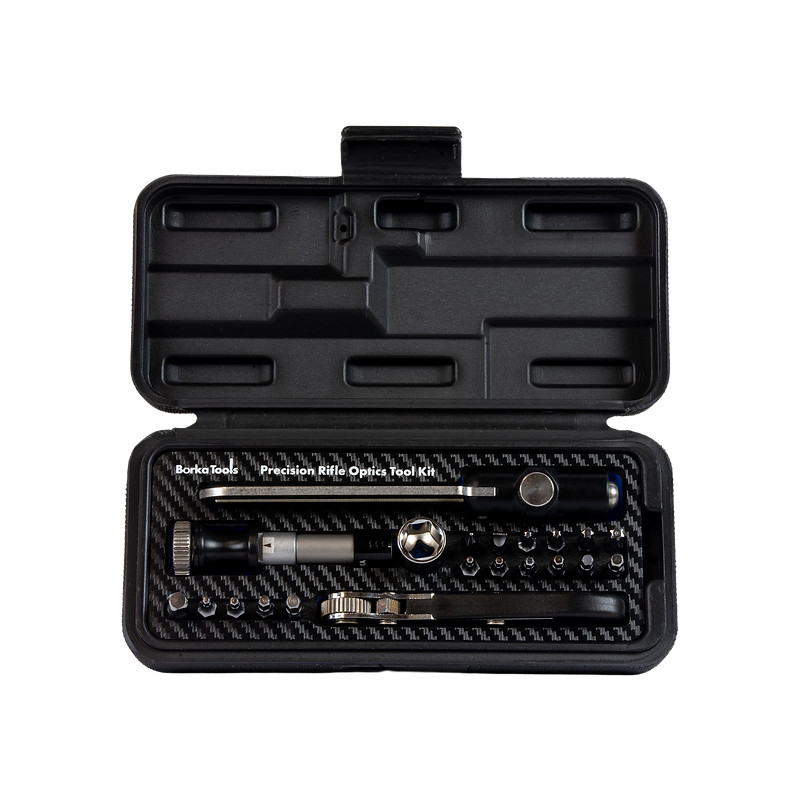 Agrandir l'image Le Borka Tools PROTK est un kit complet pour le montage et le réglage d'optiques de tir. Il intègre un tournevis dynamométrique américain BTD réglable de 10 à 70 in-lbs, 16 embouts et une mallette rigide avec mousse carbone découpée.
