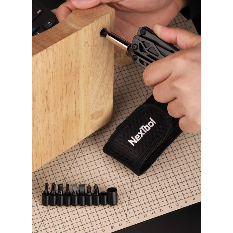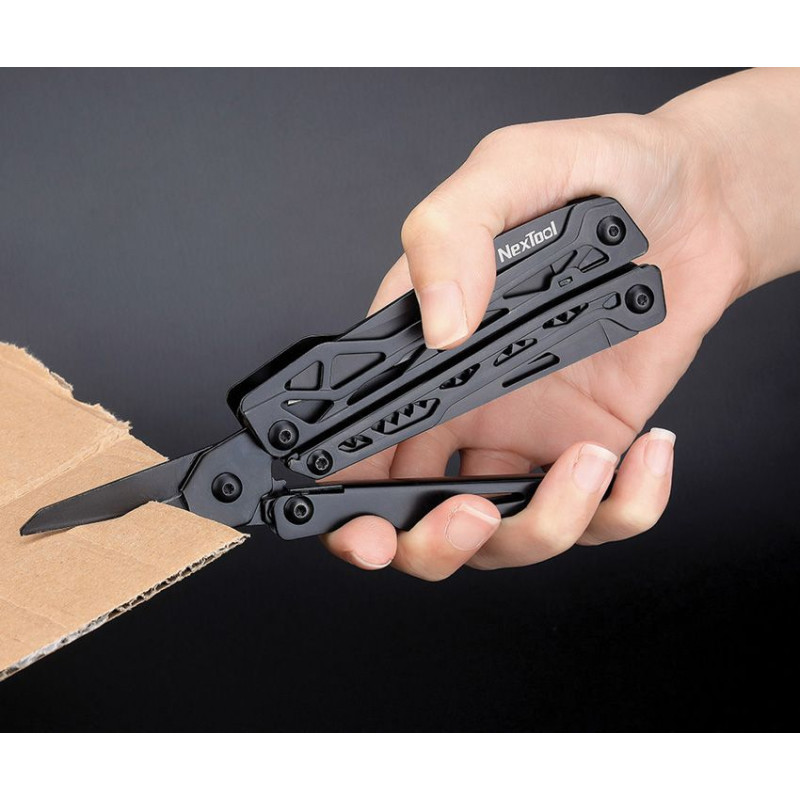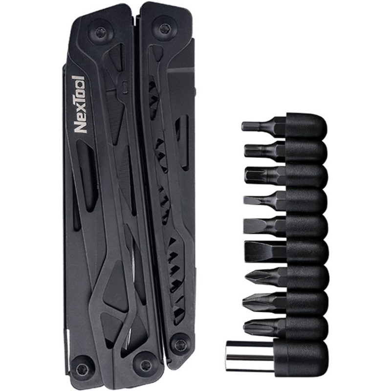 La pince multifonctions NexTool Black Knight est un multi-tool polyvalent 11-en-1 avec finition noire oxydée anti-rouille. Système NEX-SCISSORS avec ciseaux pleine taille. Pince 30Cr13 (HRC50), lame accessible d'une main avec verrouillage. Inclut une extension magnétique et 10 embouts de tournevis interchangeables.