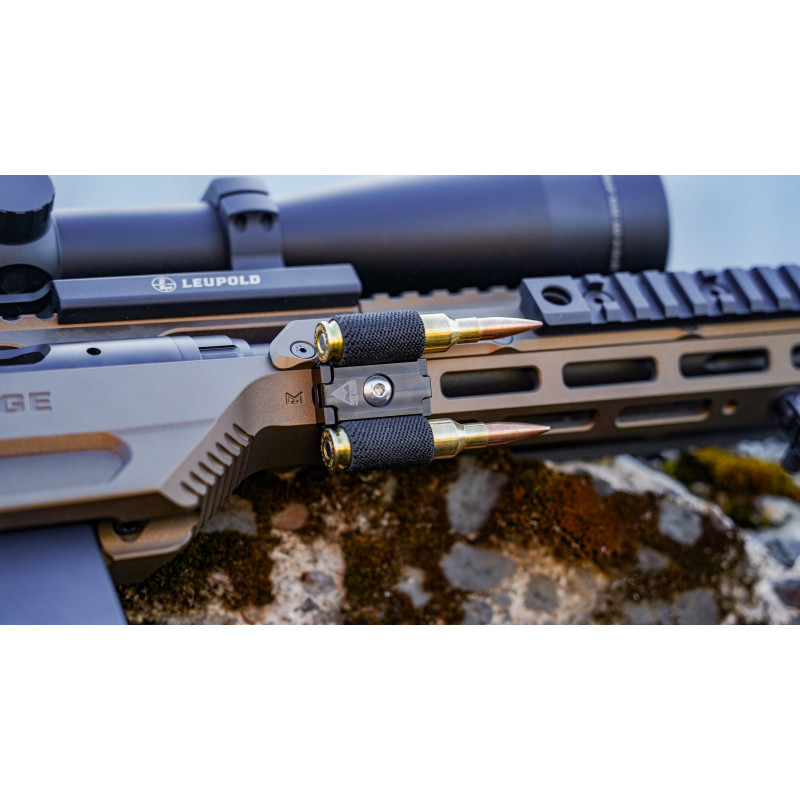 Le porte-munitions M-LOK pour 2 cartouches de fusil, du .223 au .450 Legend R2S2 de GrovTec. Corps aluminium anodisé noir en 2 pièces avec boucles élastiques durables. Se monte sur un seul slot M-LOK avec vis et T-nut. Idéal pour rechargements rapides sur fusils à verrou ou levier.