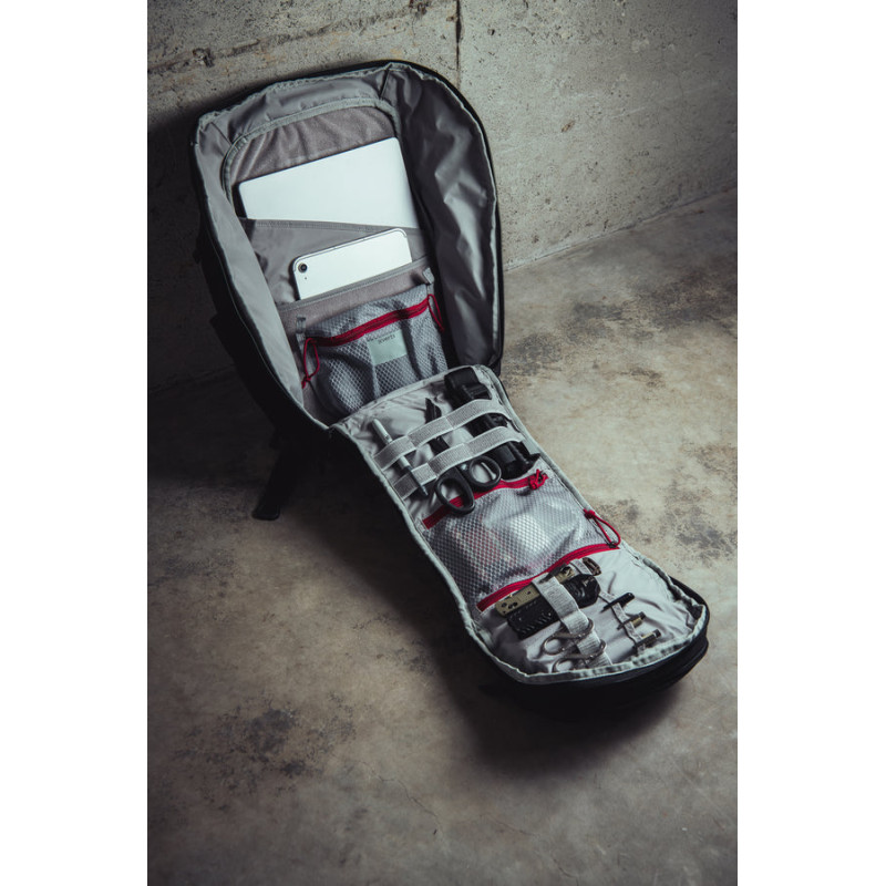 L'agencement intérieur maximise l'organisation avec des poches filet stratégiquement placées, des emplacements équipement et des panneaux d'attache pour accessoires modulaires. La pochette frontale zipée révèle des emplacements horizontaux pour chargeurs et kits médicaux, tandis que l'élastique extensible retient les pochettes et autres articles modulaires. La pochette latérale avec organisation intégrée offre un accès facile à l'hydratation ou l'équipement. Les poches extensibles latérales s'adaptent à diverses tailles de bouteilles d'eau. La pochette supérieure doublée protège lunettes de soleil et objets sensibles des rayures. L'intérieur de couleur claire améliore la visibilité. Les bretelles rembourrées ajustables incluent des boucles élastiques pour accessoires et des boucles de dégagement rapide.