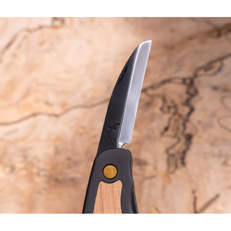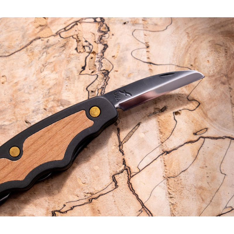 Le JKN95 Tri-Jack Pro est un couteau pliant de sculpture à 3 lames verrouillables : Roughing, Detail et Mini-Cutting. Manche pistolet aluminium avec insert cerisier.