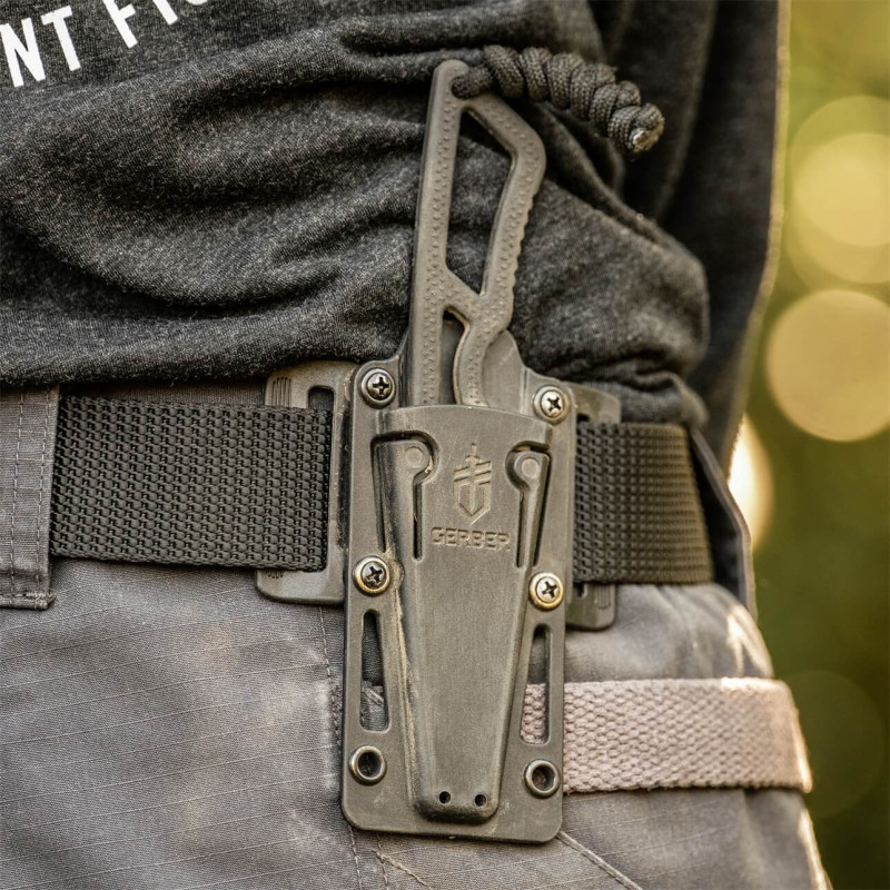 Le Ghostrike est équipé d'une lame drop point à tranchant lisse de 8,1 cm offrant une précision de coupe exceptionnelle. Sa construction full tang (soie traversante) assure une robustesse maximale malgré son poids plume. L'étui en nylon renforcé de fibre de verre intègre un ingénieux système de double détente avec encoches sur la lame, produisant un clic audible lors de l'insertion tout en permettant un dégainage rapide d'une seule main sans bouton de verrouillage. Les boucles de ceinture modulaires de 1,75 pouces (44,5 mm) se détachent facilement des œillets pour adapter la configuration de port selon vos préférences. La dépression sur le dos de la lame permet un placement optimal du pouce pour une prise "Filipino grip" appréciée en arts martiaux. L'orifice pour dragonne offre des options de transport supplémentaires. Le revêtement caoutchouté du manche assure également un contrôle optimal avec des mains mouillées ou gantées.