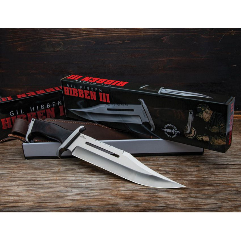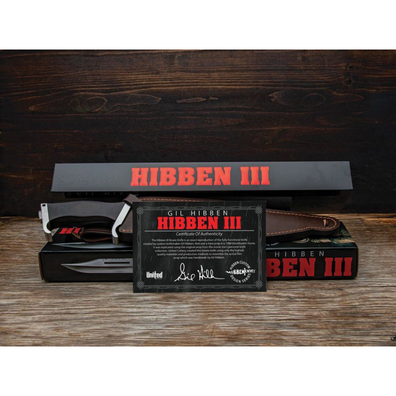 Le couteau Bowie United Cutlery Hibben III Bowie est une réplique du légendaire Bowie conçu par Gil Hibben pour le film Rambo III. Ce couteau imposant reproduit fidèlement le design emblématique utilisé par John Rambo, avec garde fantaisie et pommeau travaillé.